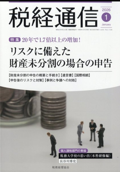 税経通信 2026/1月号 (税務経理協会:刊行) の特集記事 「20年で1.7倍以上の増加!リスクに備えた財産未分割の場合の申告」のなかで、税理士 阿久津 貴典が「一般的な財産未分割の場合の申告における概要と手続き」(P.18~P.29)を執筆しております。本稿では、財産未分割の場合の申告の概要や手続き解説しております。