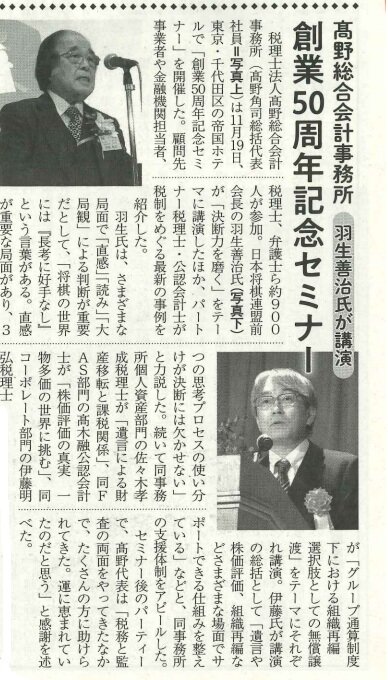 「納税通信」(第3900号)に創業50周年記念セミナーの記事が掲載されました