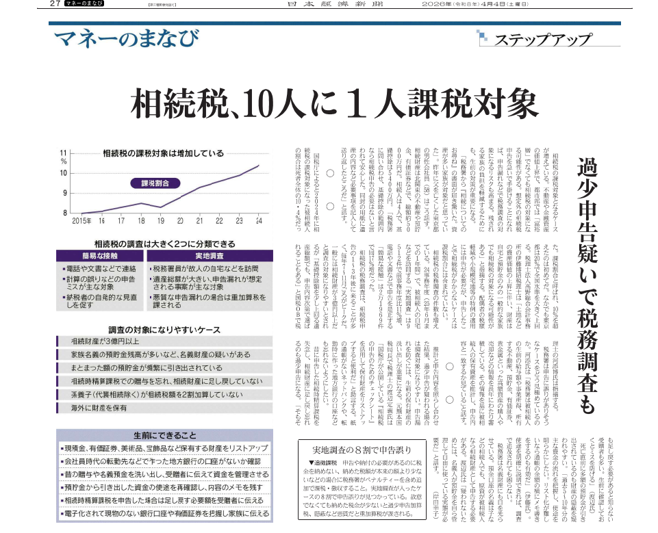 日本経済新聞4月4日朝刊27面「マネーのまなび」コーナーにて、相続の特集記事「相続税、10人に1人課税対象」が掲載され、弊事務所のパートナー 税理士 伊藤 博昭が取材を受け、コメントをさせていただきました。記事では、不動産や金融資産の価値上昇により、相続税の課税対象となるケースが「10人に1人」の水準に達している現状や、想定外の申告で過少申告となり税務調査のリスクが高まる点などが取り上げられています。生前の相続対策の重要性について、税理士 伊藤博昭のコメントを交えながら解説されています。